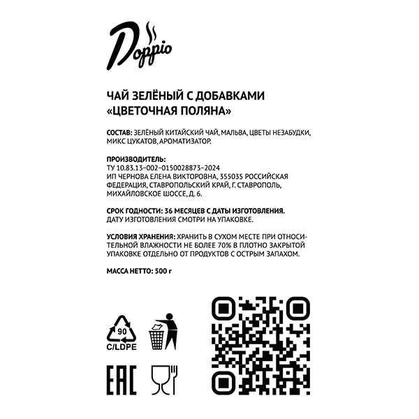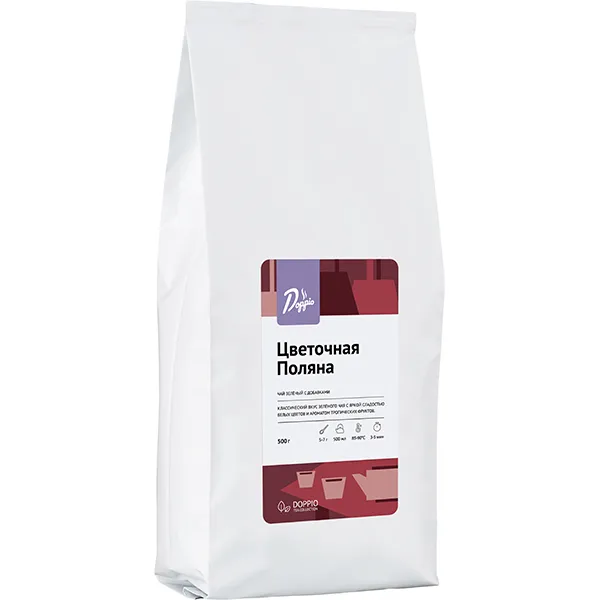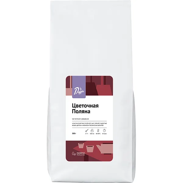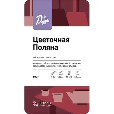 Производитель в своей чайной коллекции Doppio tea предлагает зеленый чай с оригинальным вкусом. «Цветочная поляна» содержит китайский листовой чай, цветы мальвы и незабудки, цветочную гамму в этом составе дополняет микс цукатов. Такое сочетание дарит напитку насыщенный аромат свежих цветов и цитрусов, и яркий необычный вкус.
