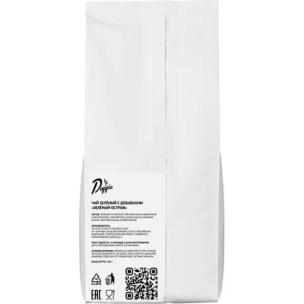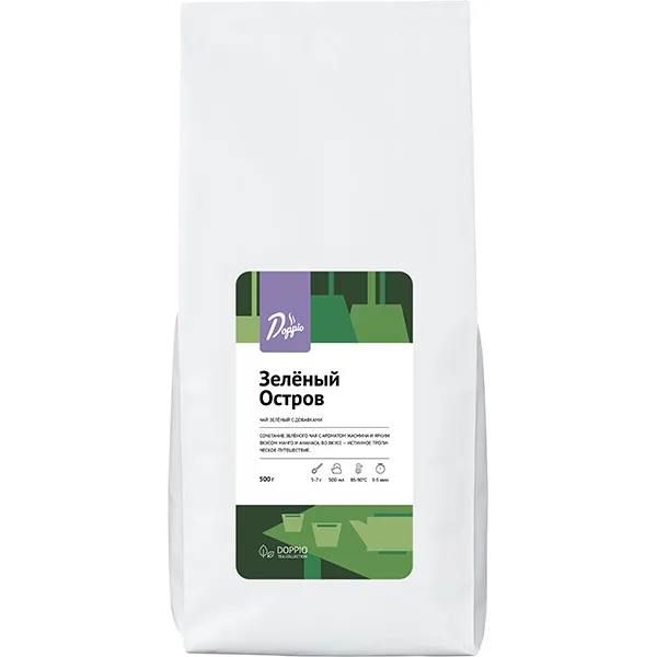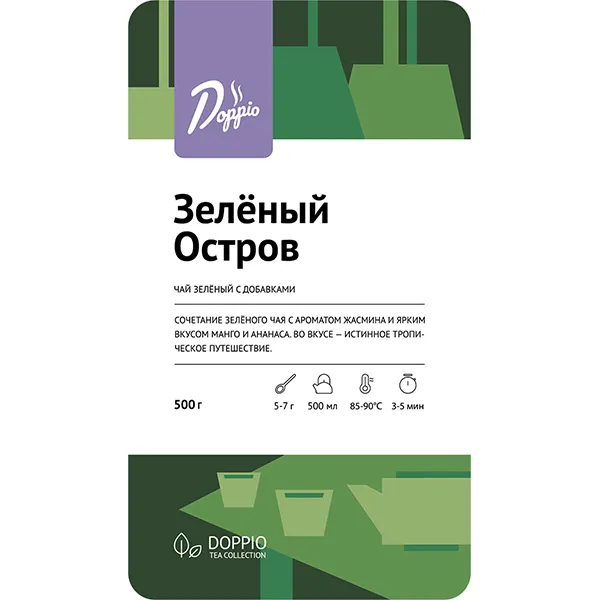 «Зеленый остров» – чай с натуральными добавками. Насыщен ароматом жасмина и вкусом сочного манго, красного и желтого ананаса. В состав добавлен ароматизатор, который лишь усиливает китайский жасминовый чай – моли хуа ча. Это любимый напиток знатоков чая, также известный как «Запах Весны». Производитель Doppio дополнил его вкусом классического зеленого чая, также выращенного в Китае.