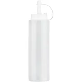 Емкость цилиндрической формы с тонким конусообразным носиком обеспечивает удобство при захвате и точную дозировку. Крышка съемная: можно наполнять через широкое горлышко. Белый цвет пластика подчеркивает аккуратность и чистоту, соответствуя требованиям HoReCa.
