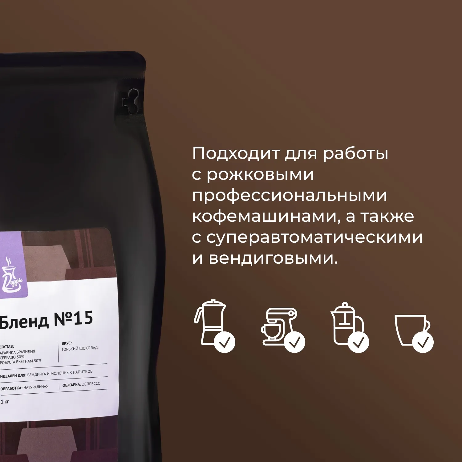 «Бленд №15» разработан для приготовления эспрессо в кофемашинах, турке либо в гейзерной кофеварке. Он станет основой для капучино, латте или американо. Сохранит насыщенный вкус и аромат даже при добавлении молока или сливок.