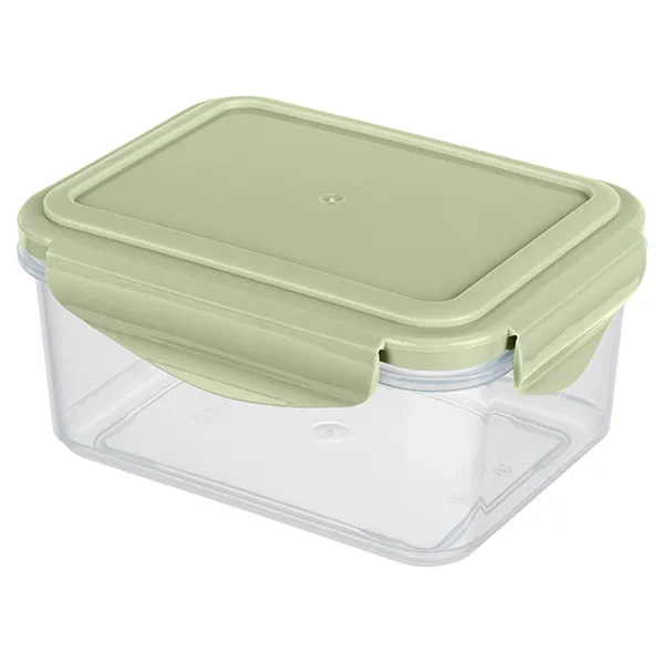 Прозрачные стенки дают мгновенный обзор содержимого. Нежно-зеленая крышка с четырьмя защелками формирует плотный обод, отвечая за полную герметичность. Встроенный силиконовый уплотнитель сохраняет аромат. А усиливающие ребра придают контейнеру дополнительную прочность и устойчивость.