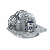 Набор бренда Prohotel включает две емкости объемом 35 мл для соли и перца, а также салфетницу и стакан под зубочистки. Все элементы размещены на металлической подставке из нержавеющей стали с хромированным покрытием, что обеспечивает устойчивость на поверхности и долговечность. Размеры компактные: 155х95х75 мм – набор не занимает много места на столе.