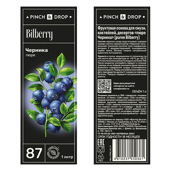 Пюре «Черника» фруктовое Pinch&Drop пластик 1л D=7,H=26см