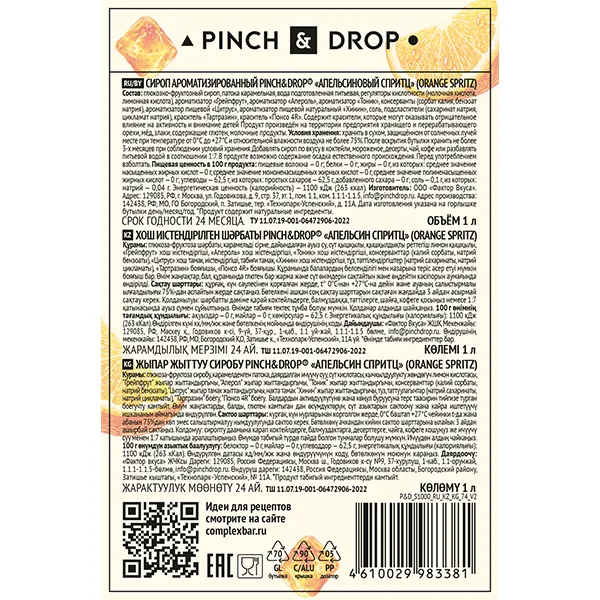 Сироп «Апельсиновый Спритц» Pinch&Drop стекло 1л D=85,H=330мм
