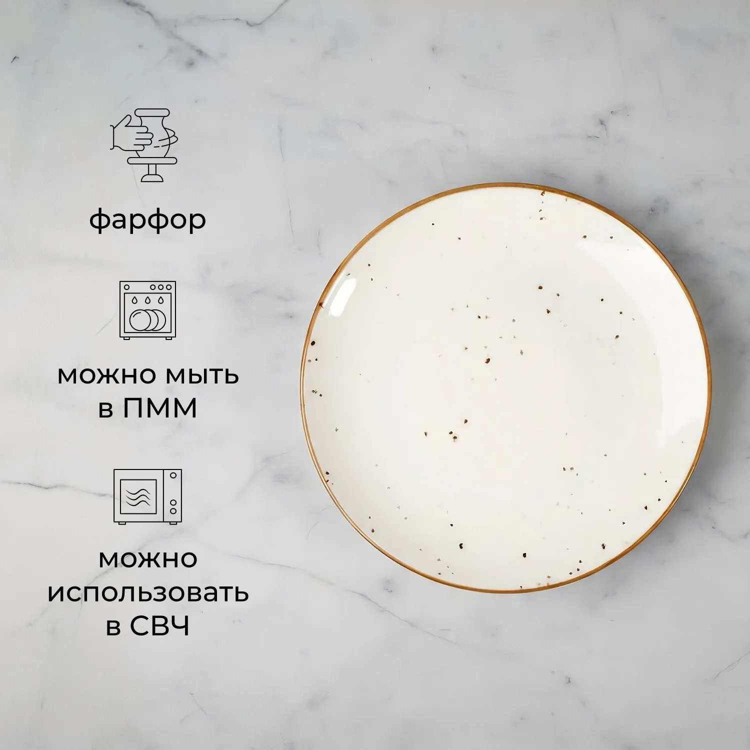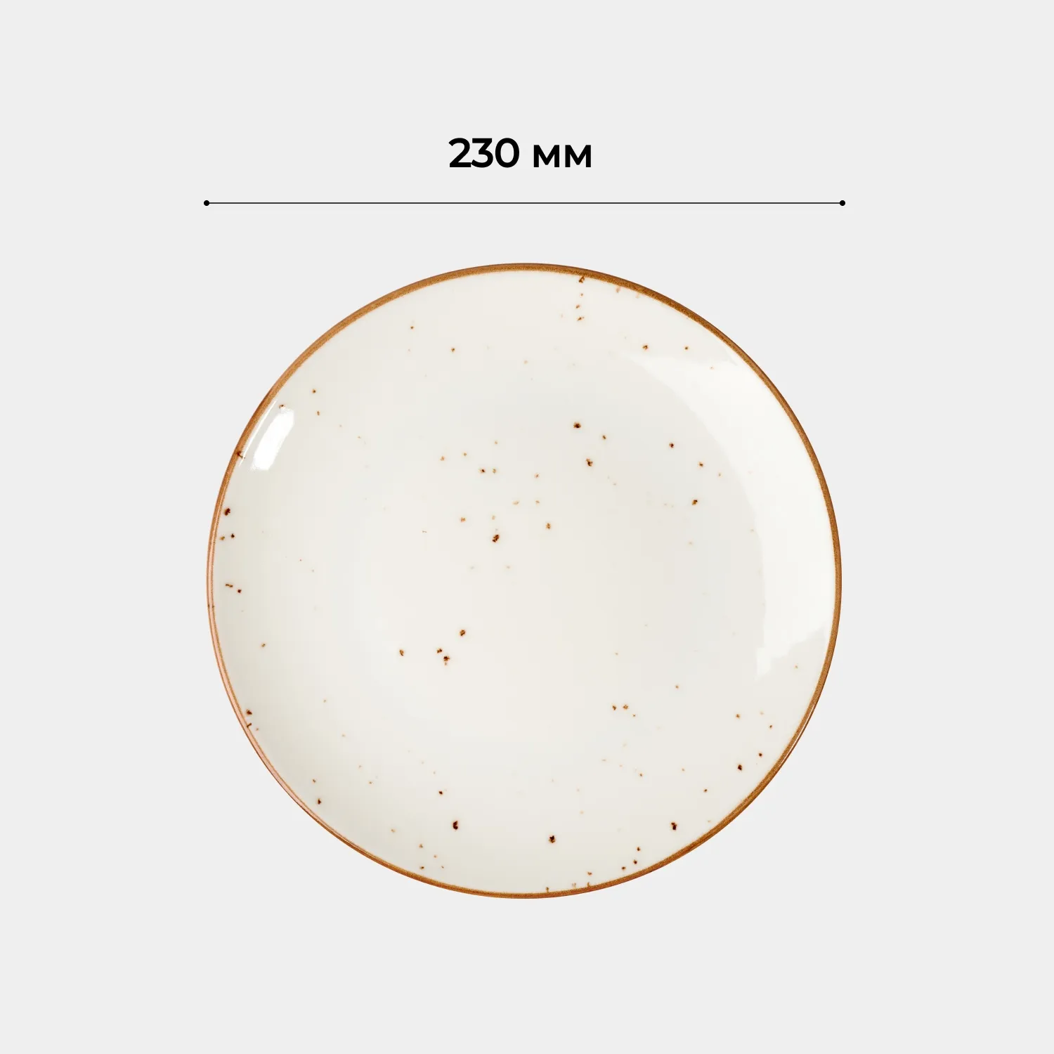 Мягкий белый фон с деликатными коричневыми крапинками и контрастным ободком придают посуде индивидуальный шарм. Диаметр 23 см оптимален для подачи основных блюд. Плотная структура фарфора и продуманная форма гарантируют устойчивость к повреждениям при ежедневной эксплуатации.